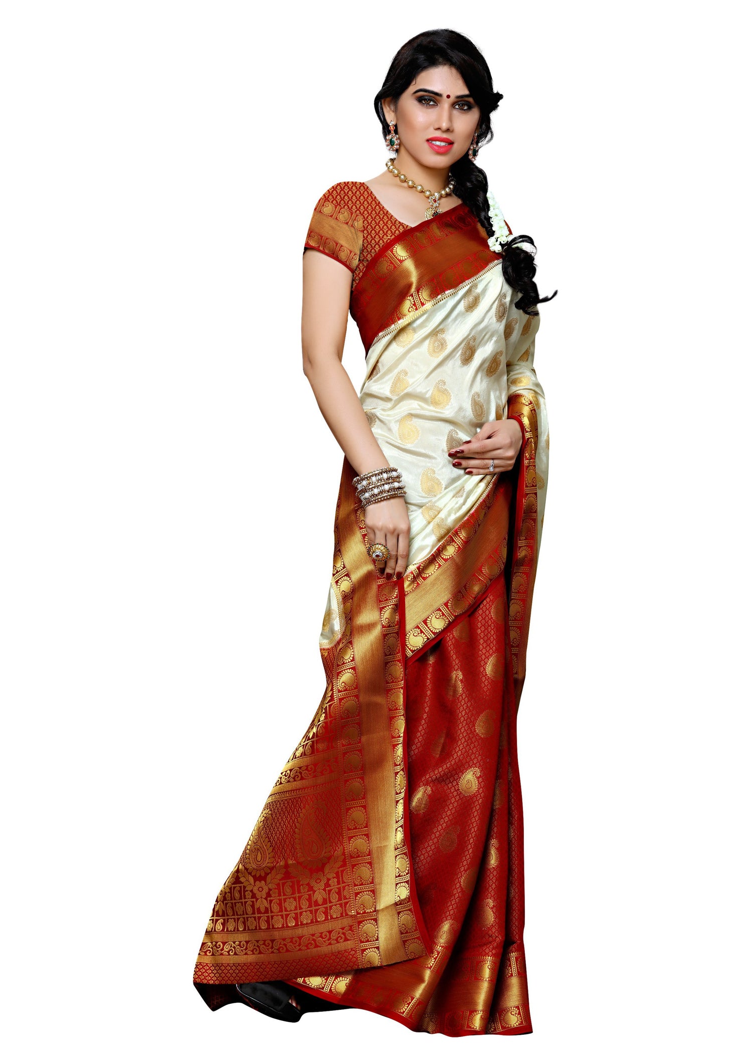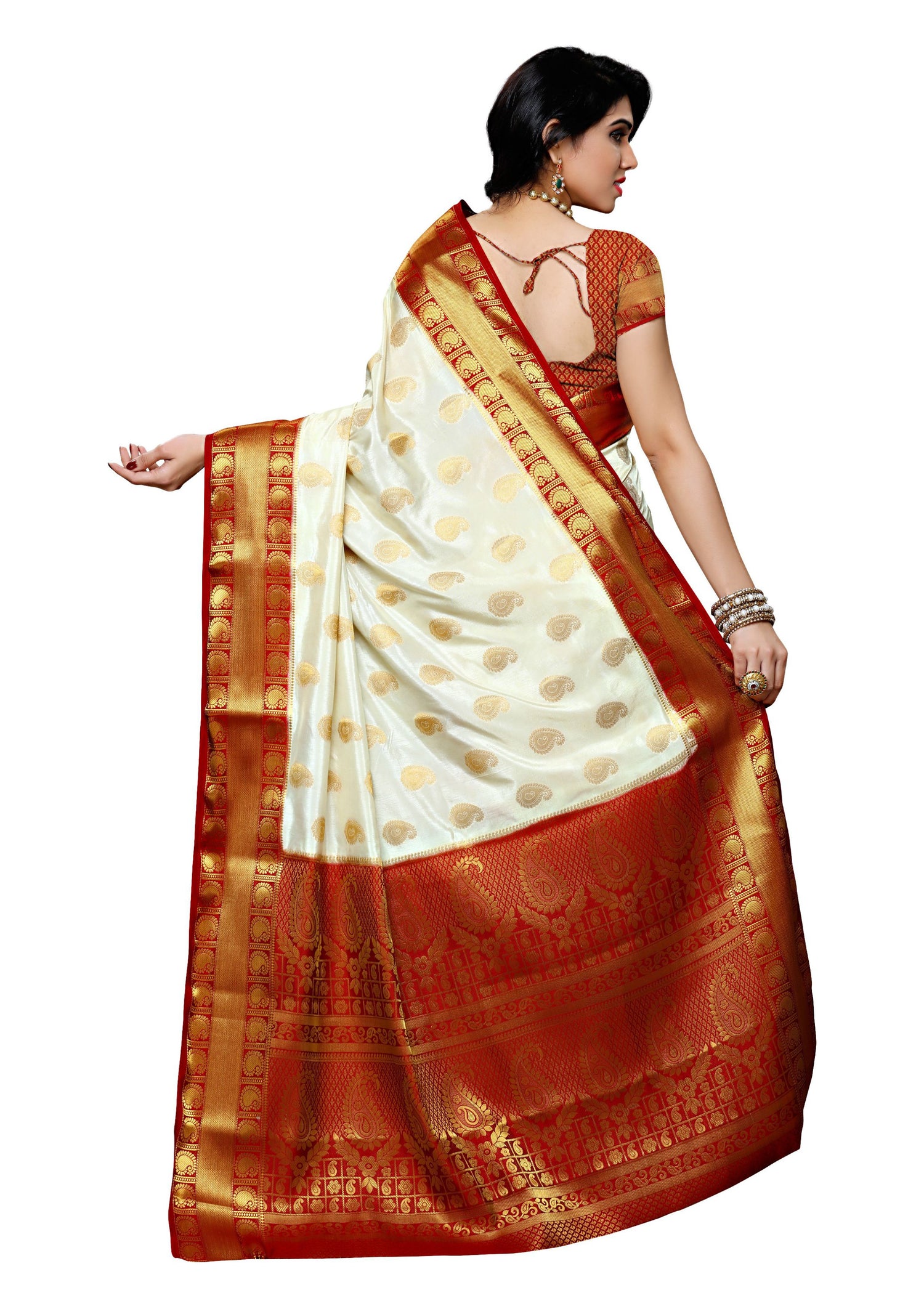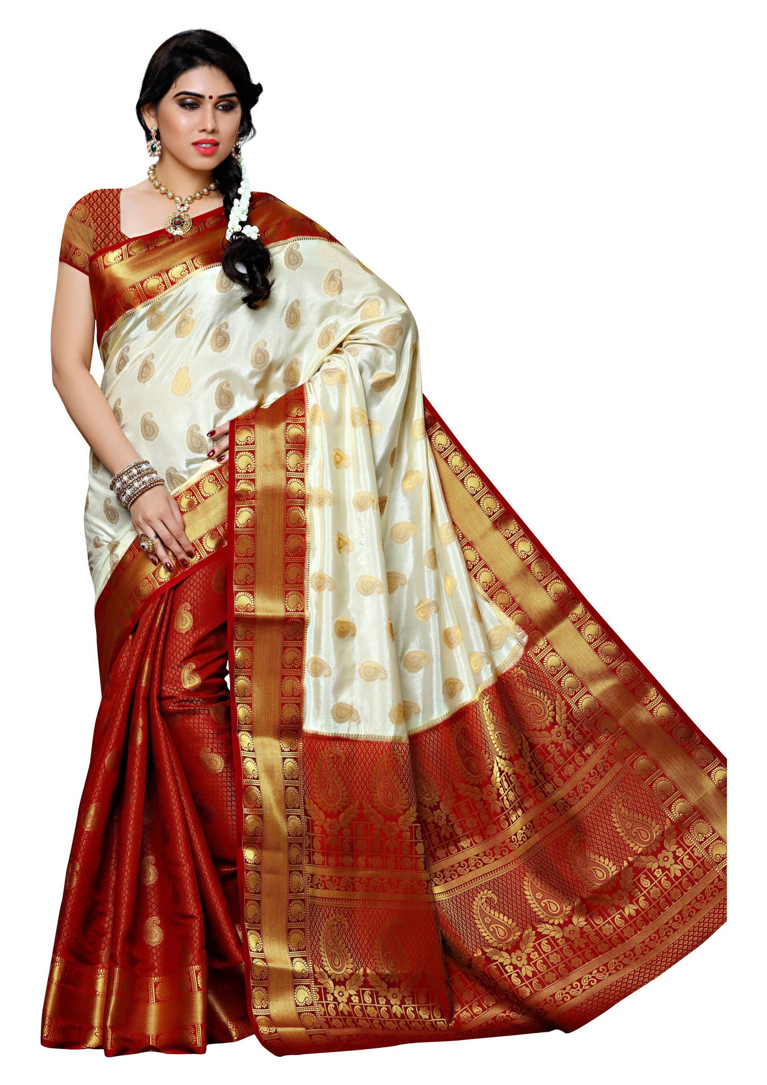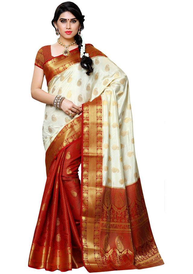 Saree Details : { Colour- Halfwhite } { Fabric- Art Silk } { Length-5.4 mts+0.80 Mts Blouse=Total 6.2 Mts} { Width-44 Inches } { Work Type: Woven Embose and Zari Design All Over }