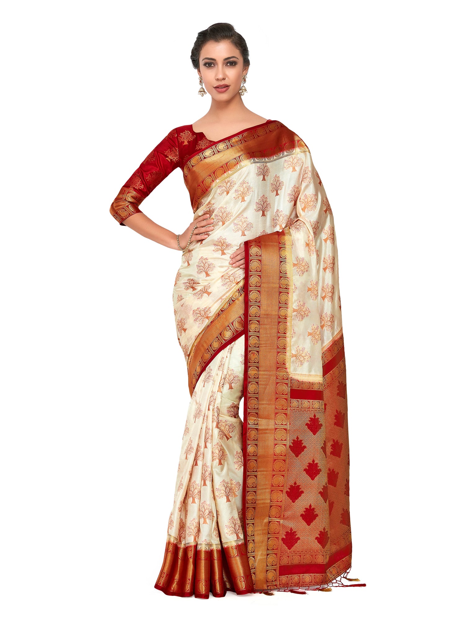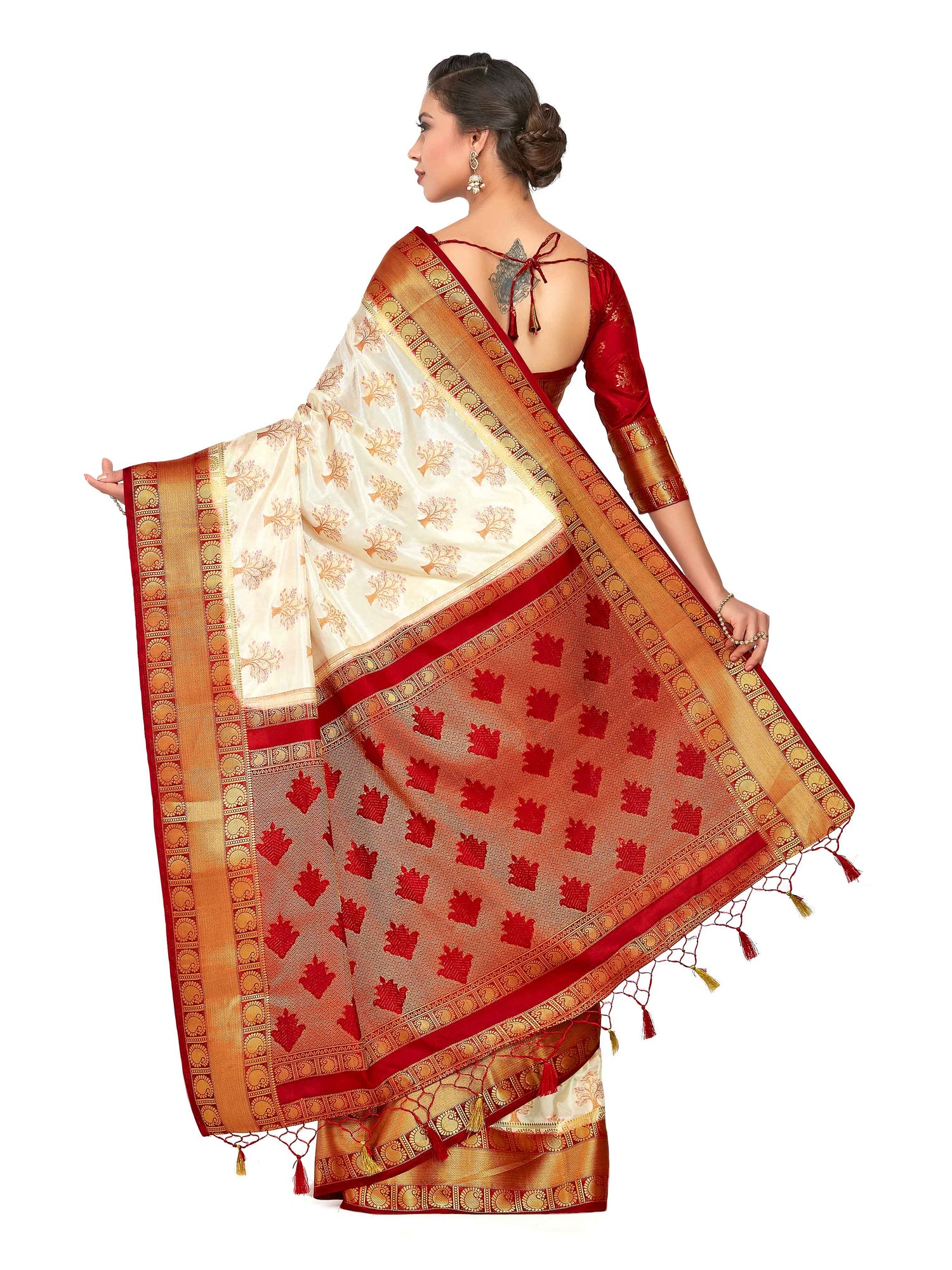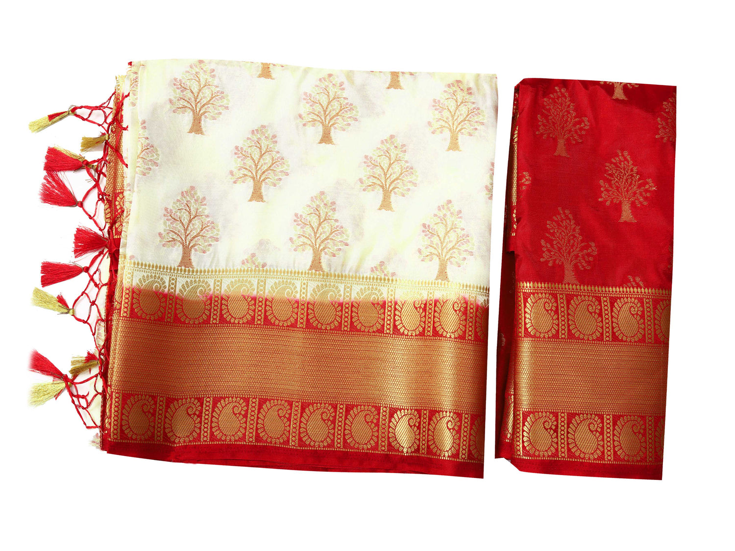 Saree Details : { Colour- Halfwhite } { Fabric- Art Silk } { Length-5.4 mts+0.80 Mts Blouse=Total 6.2 Mts} { Width-44 Inches } { Work Type: Woven Zari Butty All Over }
