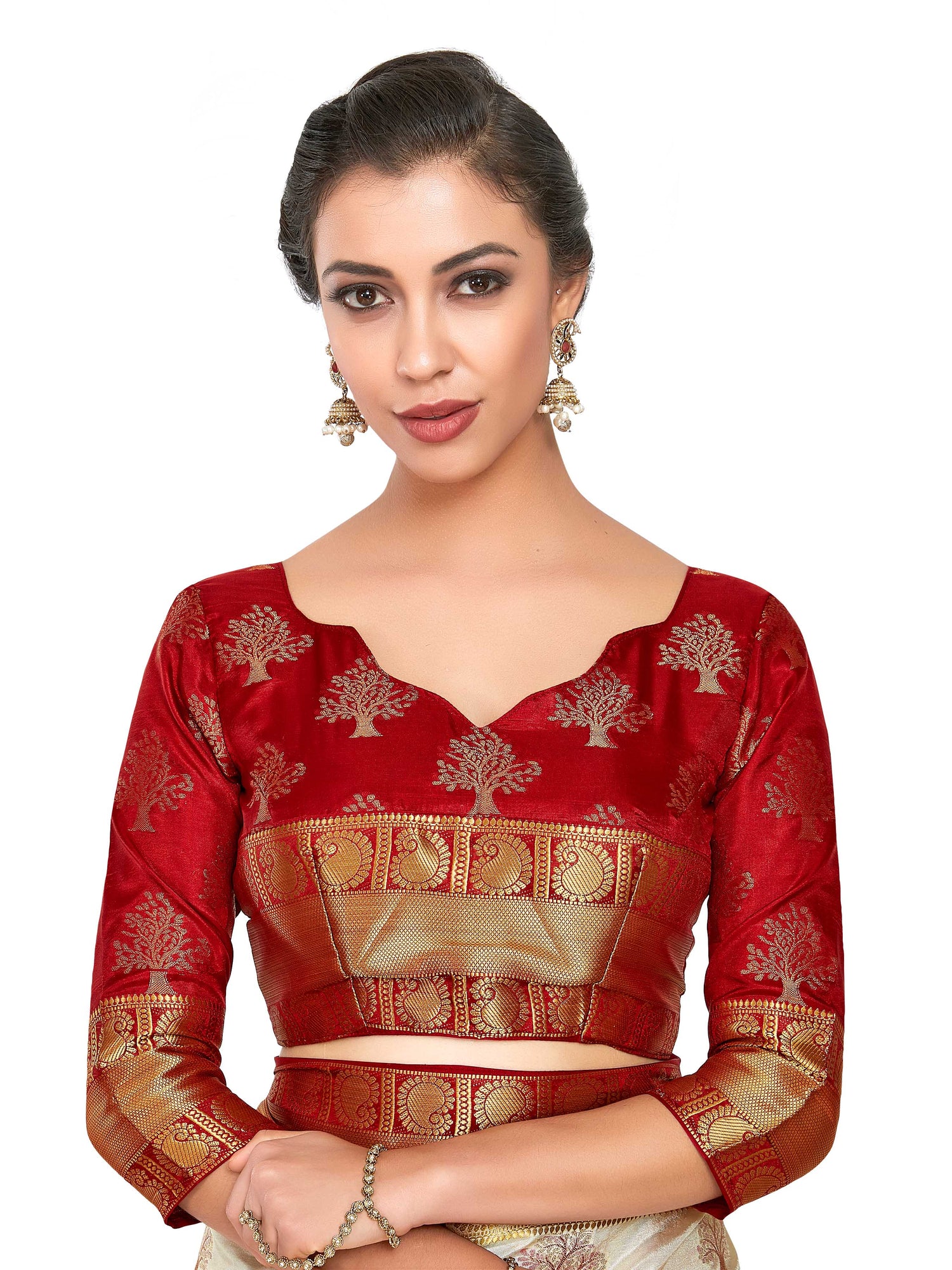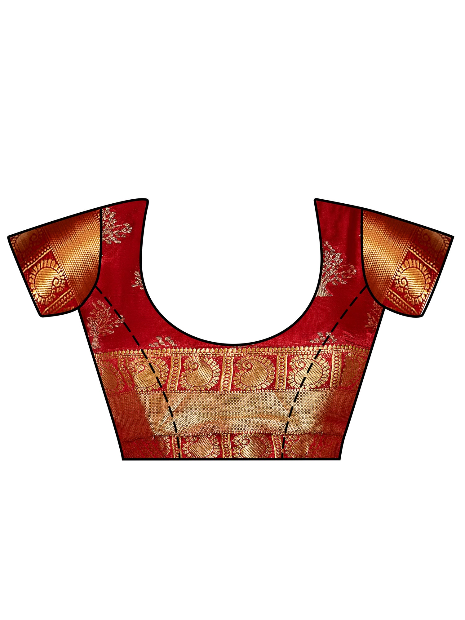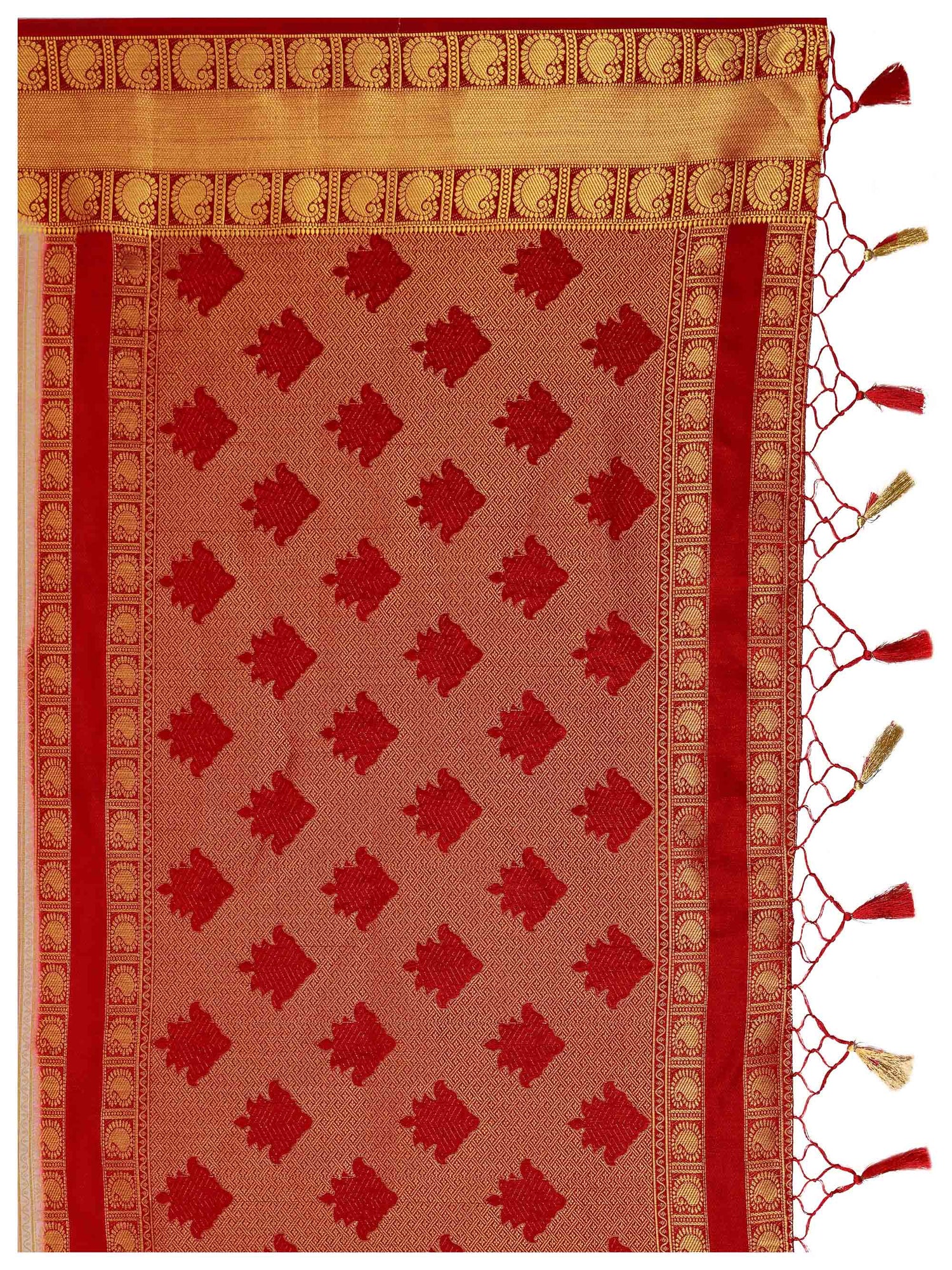Blouse Details : {Colour- Red} { Fabric- Art Silk } {Length-0.80 Unstitched Blouse Attached At the End Of Saree } {Width-44 Inches } { Type- Contrast Blouse }