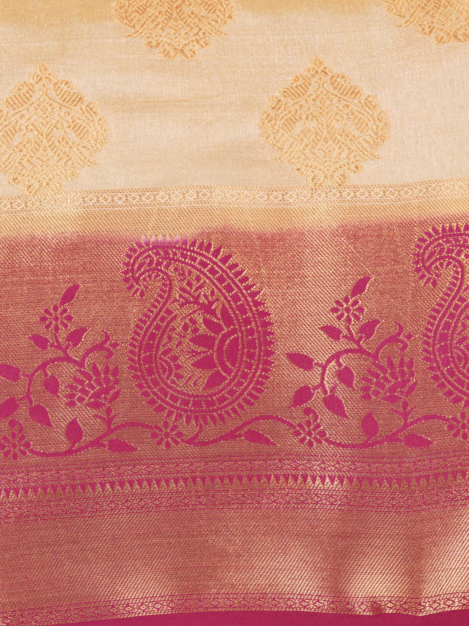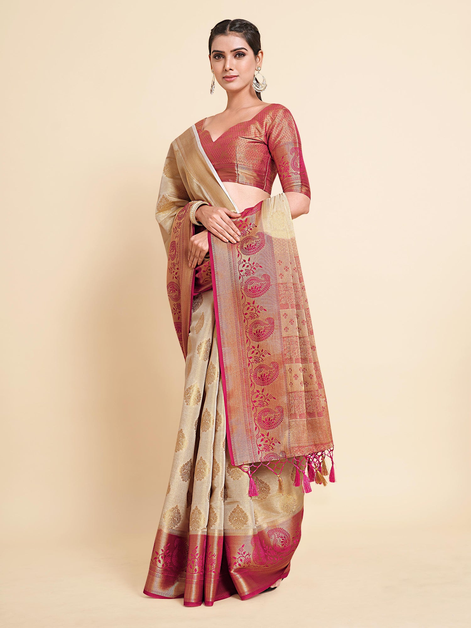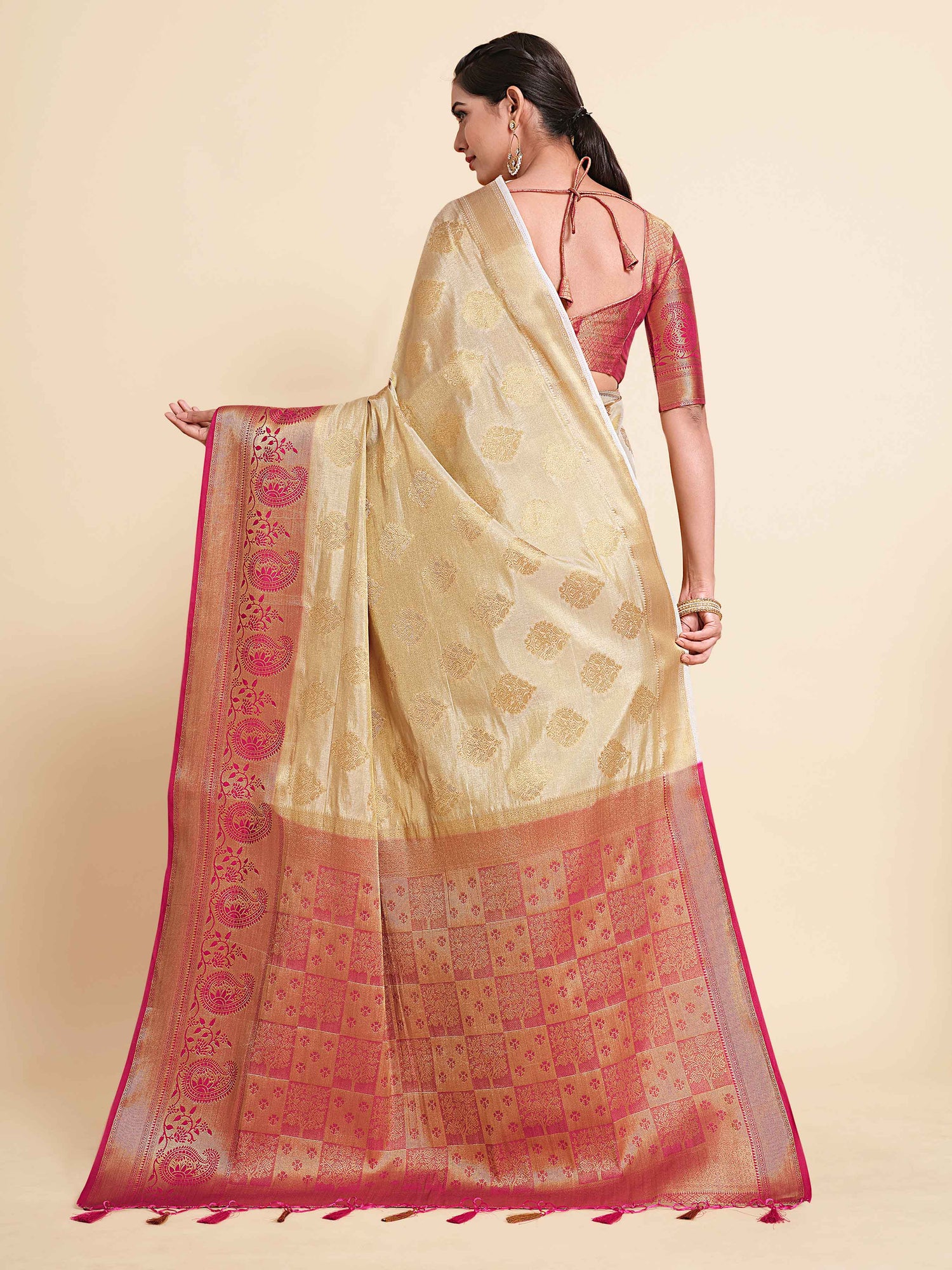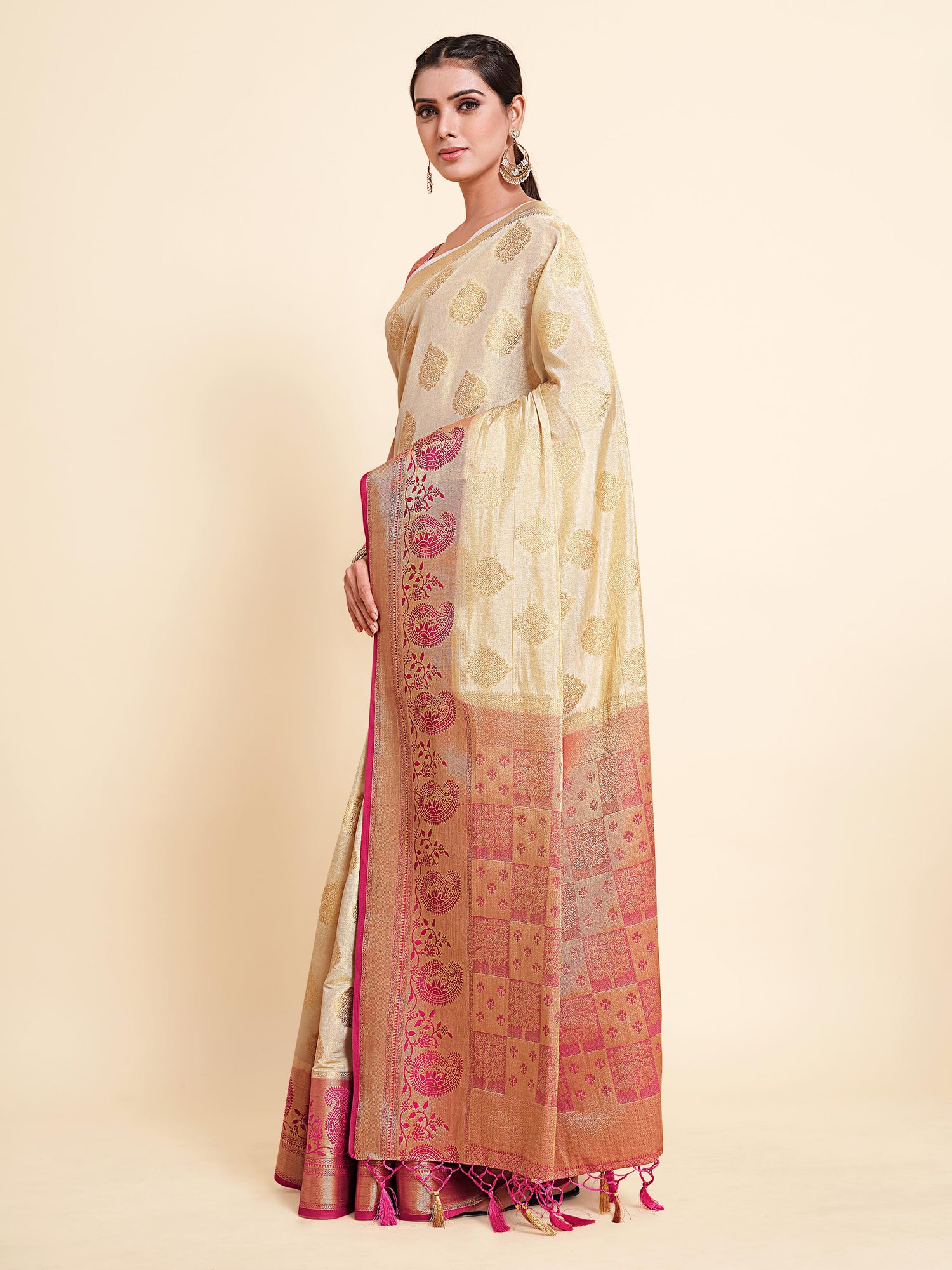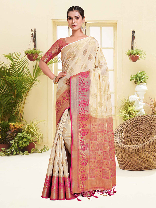 Saree Details : { Colour- Halfwhite } { Fabric- Art Silk } { Length-5.4 mts+0.80 Mts Blouse=Total 6.2 Mts} { Width-44 Inches } { Work Type: Woven Zari Design All Over }