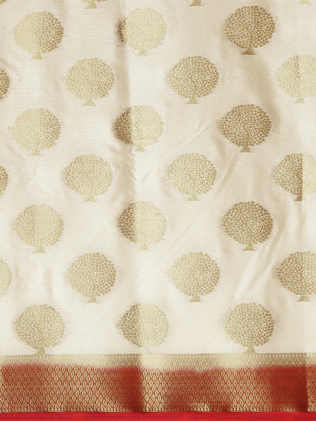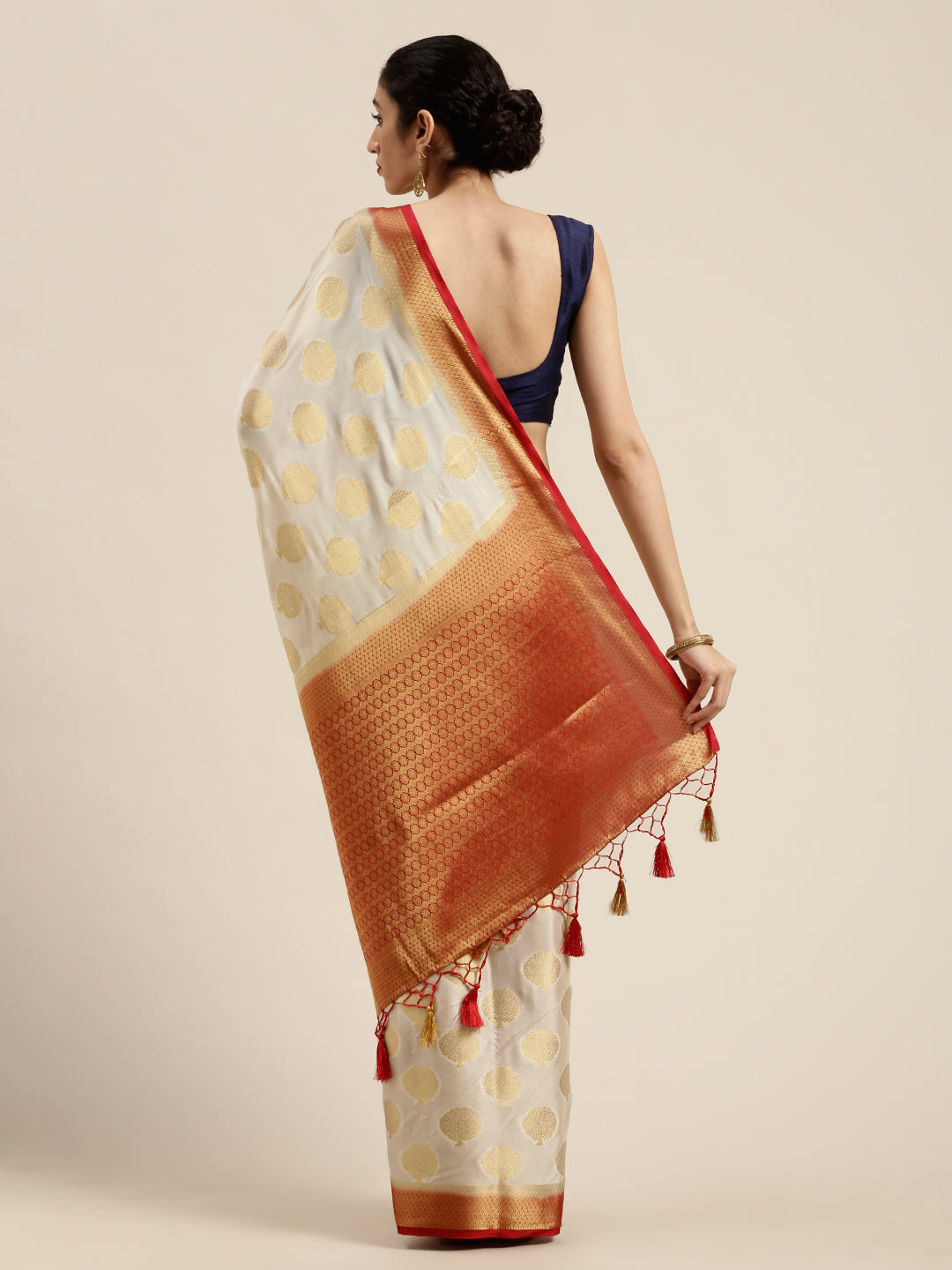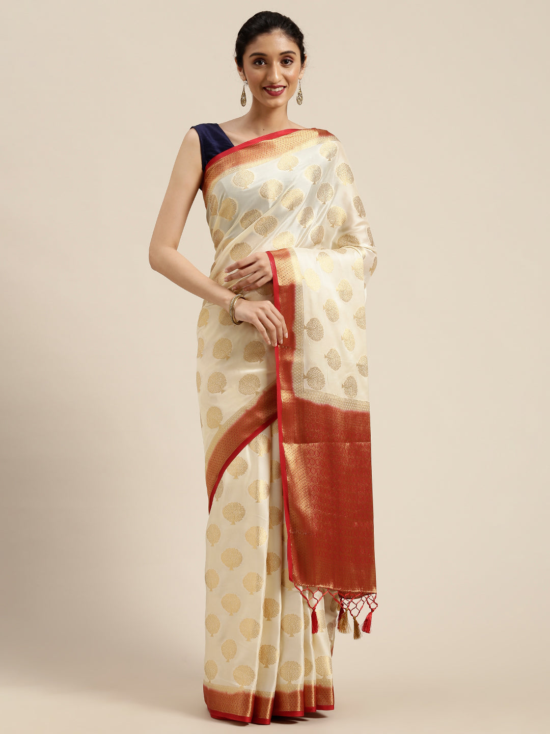 Saree Details : { Colour- Halfwhite } { Fabric- Crepe } { Length-5.4 mts+0.80 Mts Blouse=Total 6.2 Mts} { Width-44 Inches } { Work Type: Woven Zari Butty All Over }