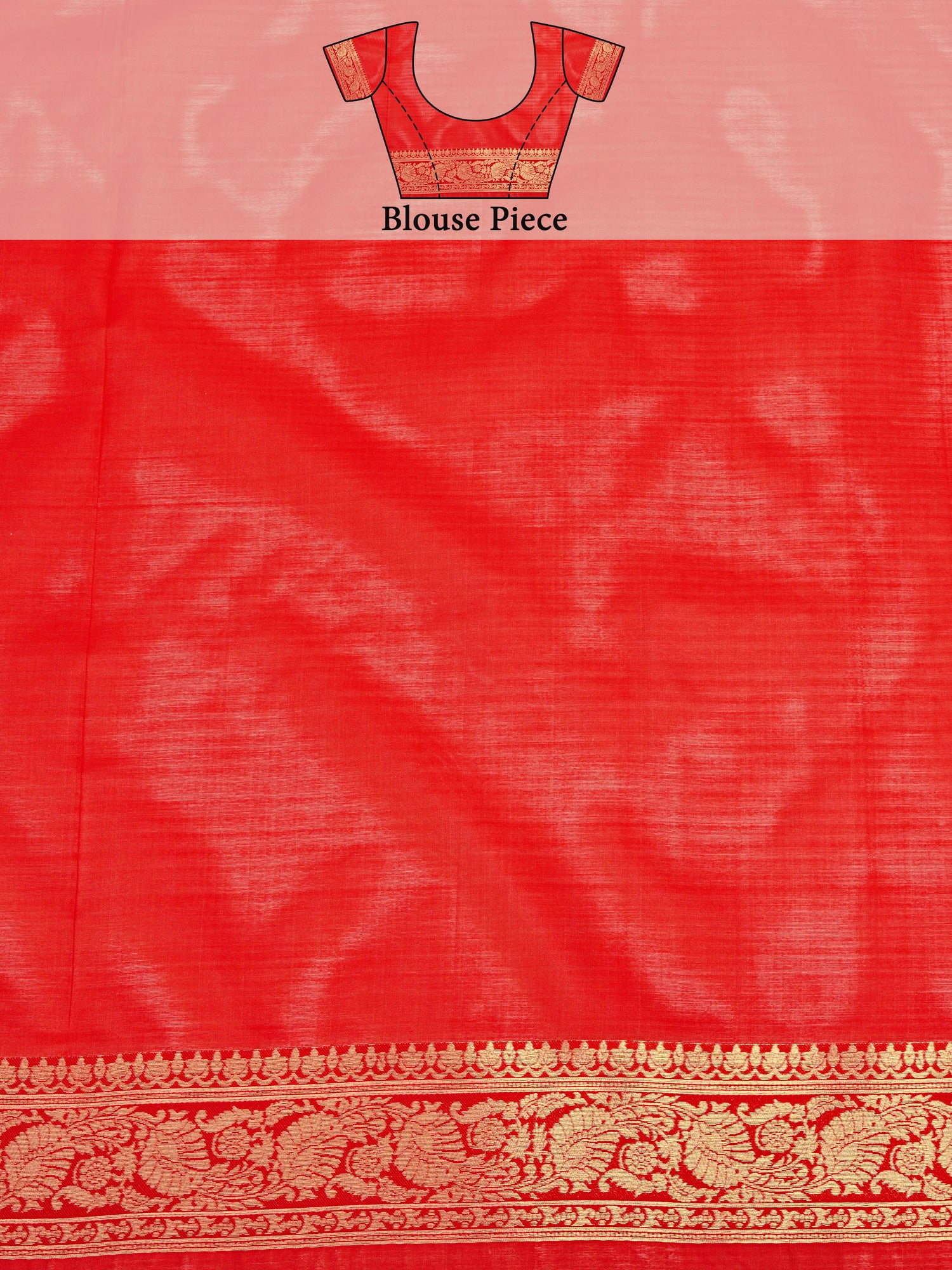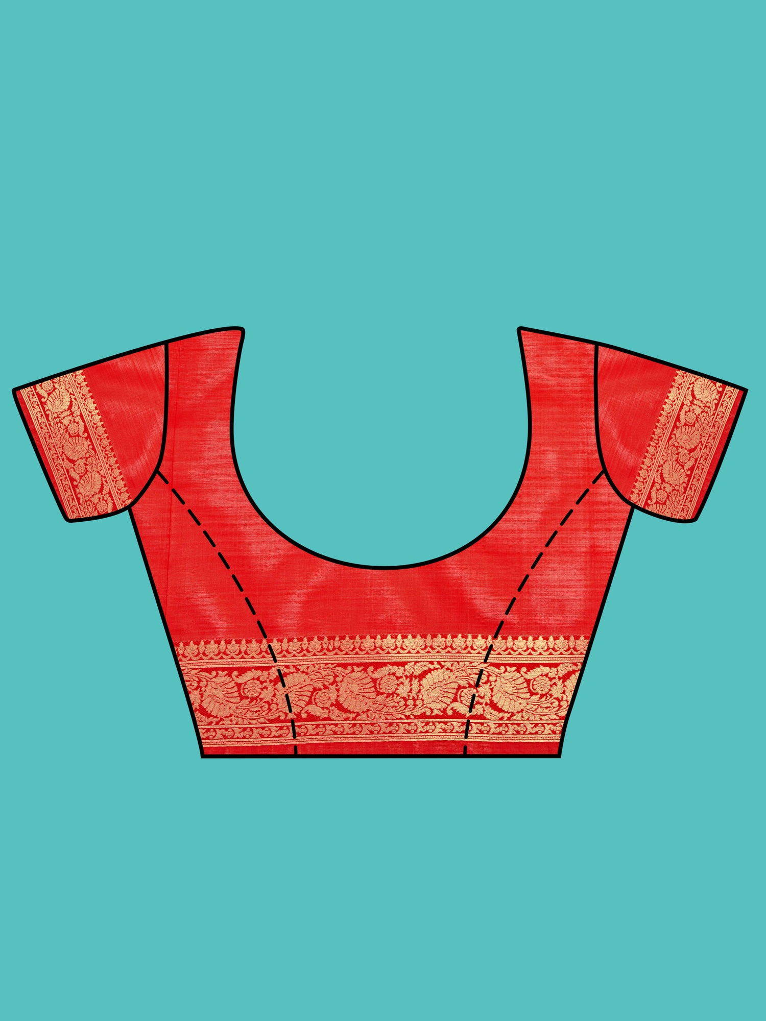 Blouse Details : {Colour- Red} { Fabric- Art Silk } {Length-0.80 Unstitched Blouse Attached At the End Of Saree } {Width-44 Inches } { Type- Contrast Blouse }