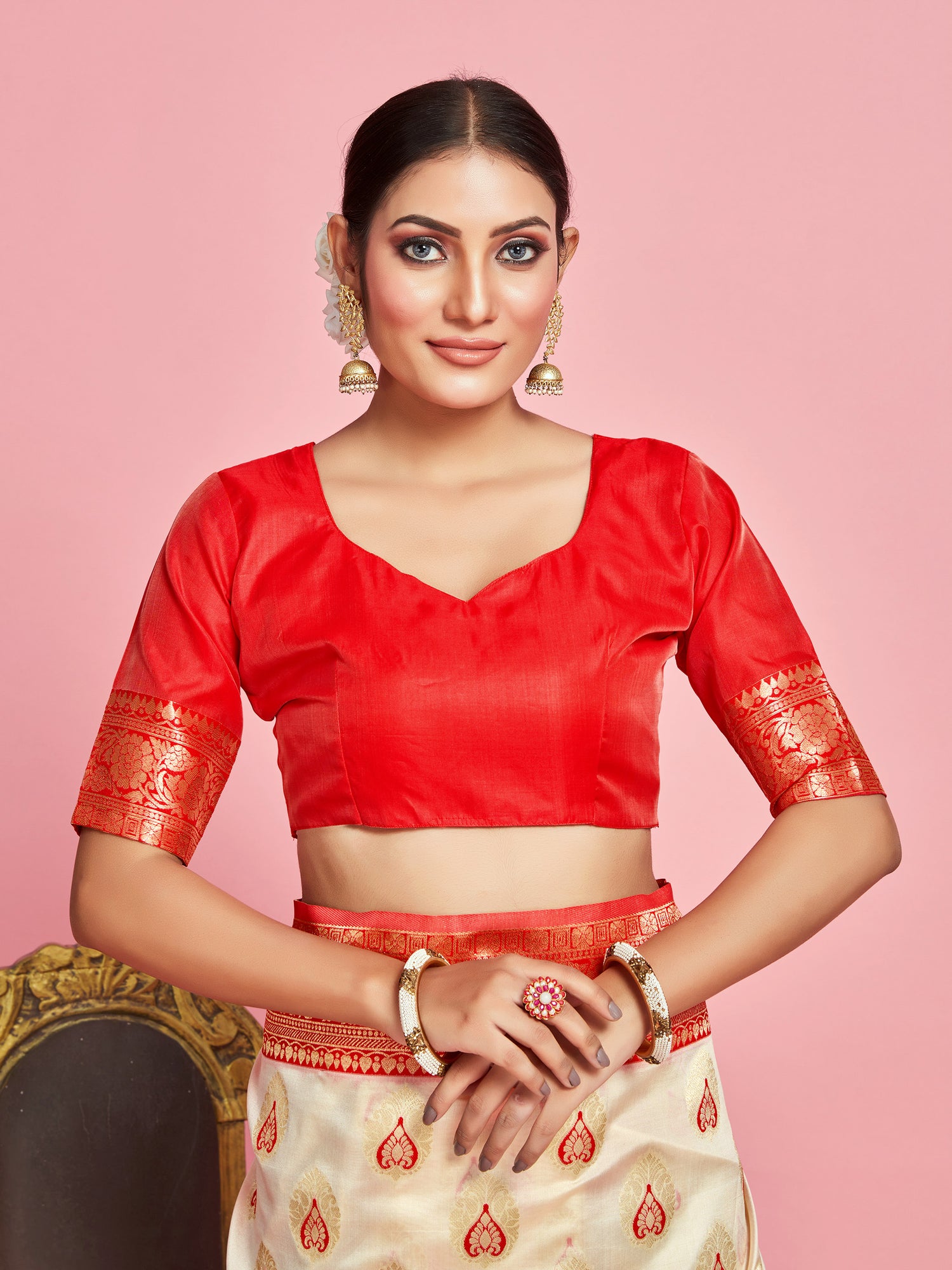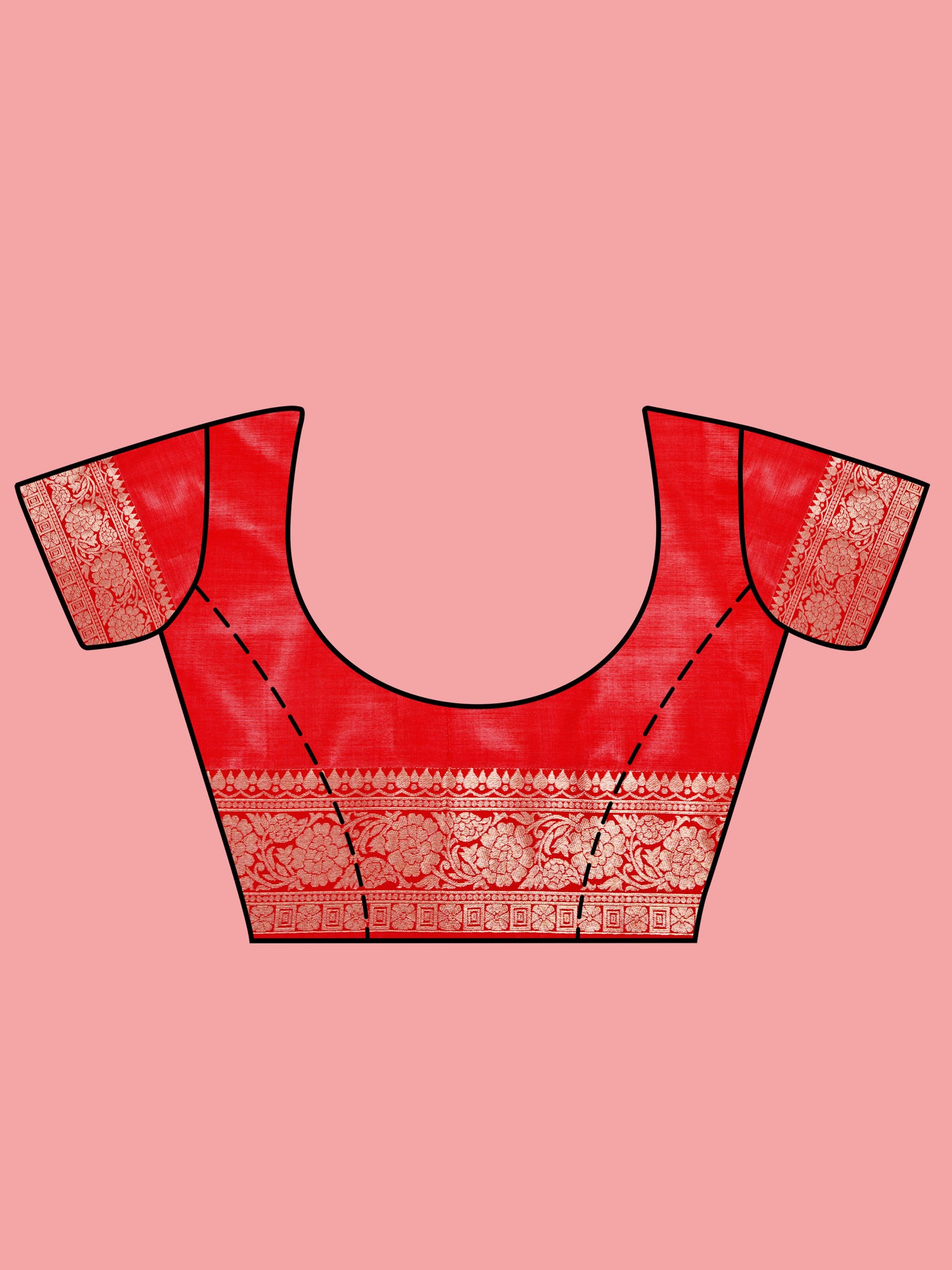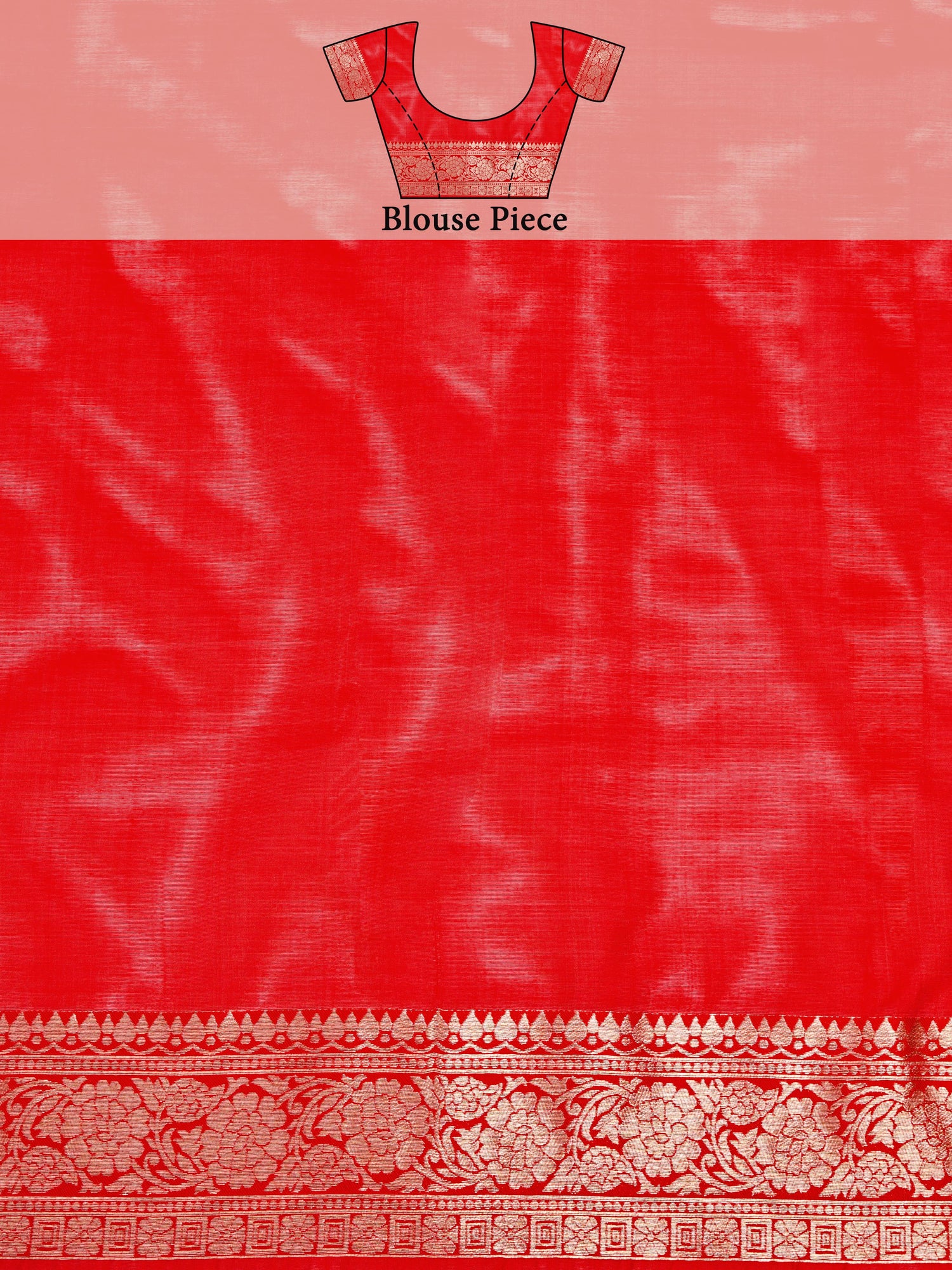 Blouse Details : {Colour- Red} { Fabric- Art Silk } {Length-0.80 Unstitched Blouse Attached At the End Of Saree } {Width-44 Inches } { Type- Contrast Blouse }