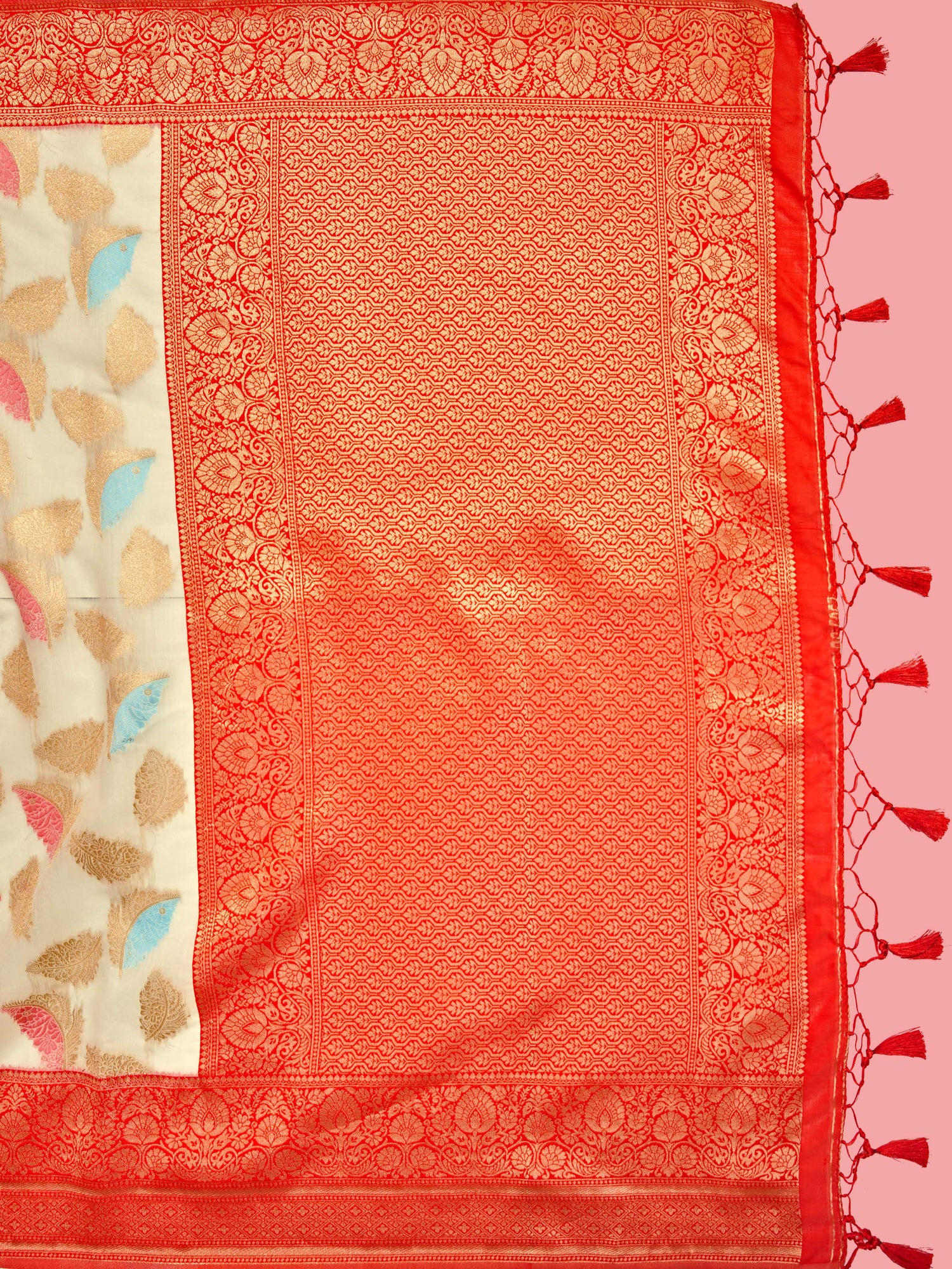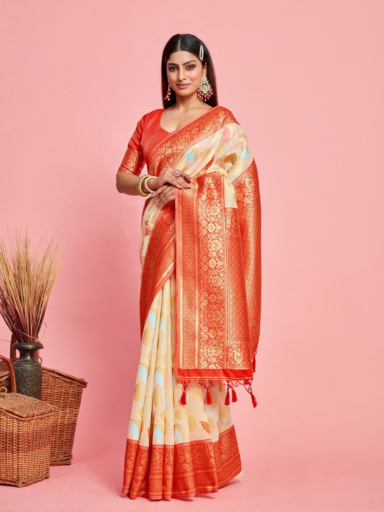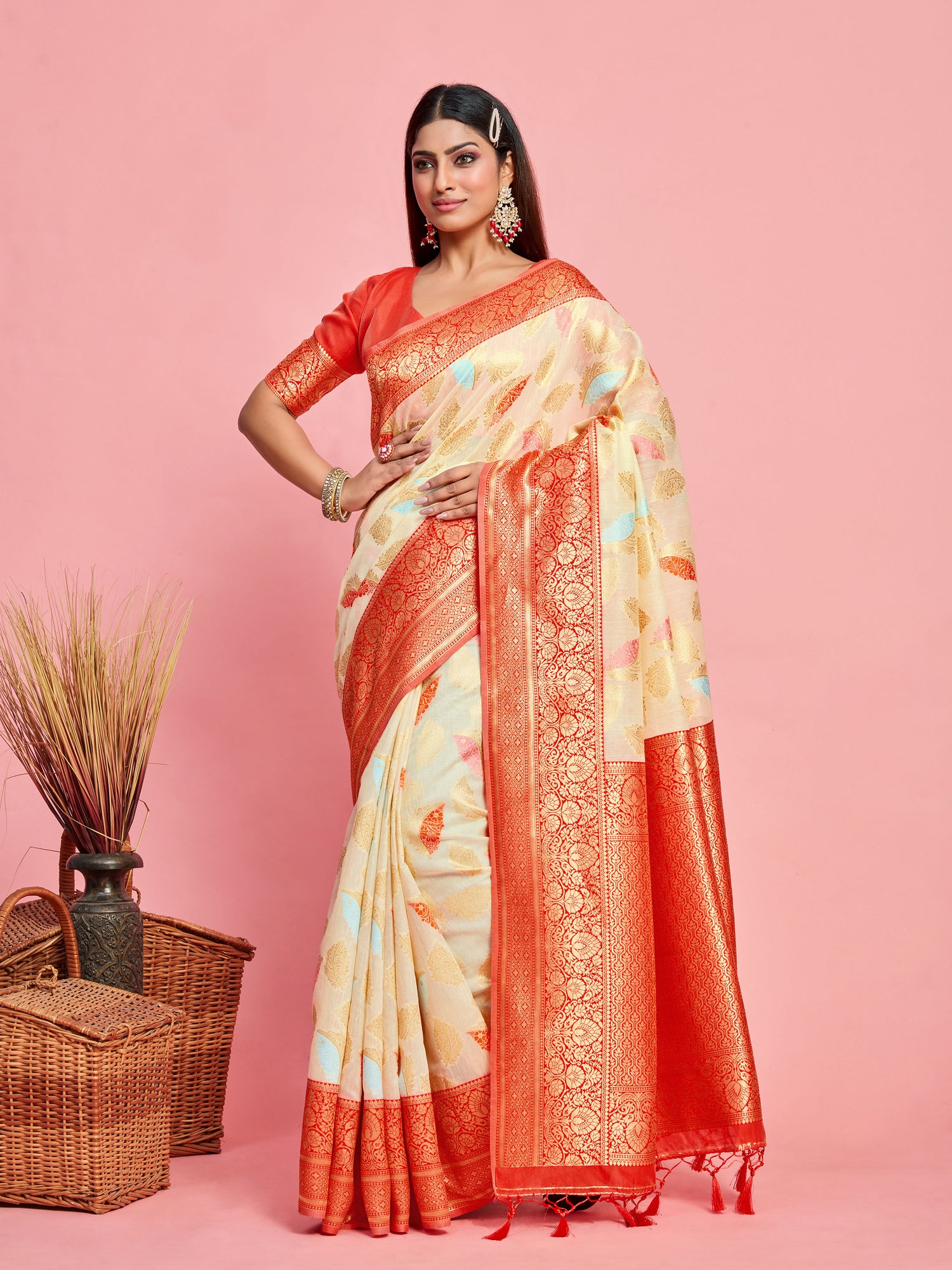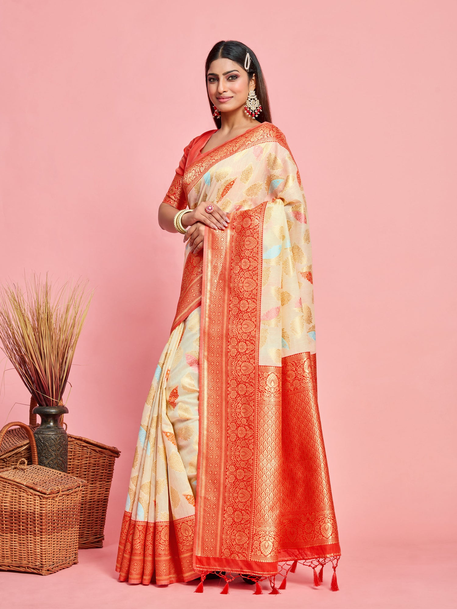 Saree Details : { Colour- Off White } { Fabric- Linen } { Length-5.4 mts+0.80 Mts Blouse=Total 6.2 Mts} { Width-44 Inches } { Work Type- Woven Mixture Of Zari And Woven Thread design All over }