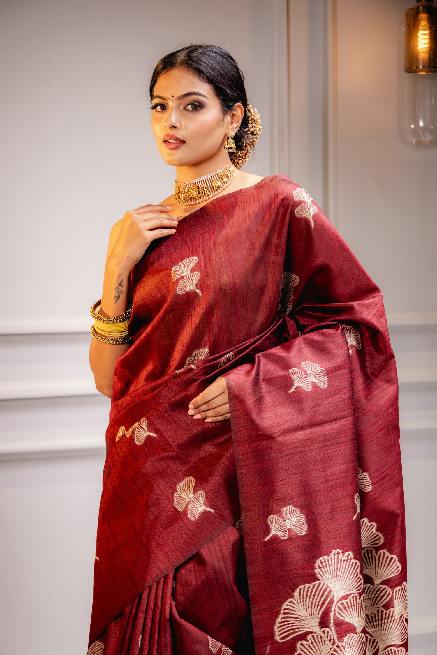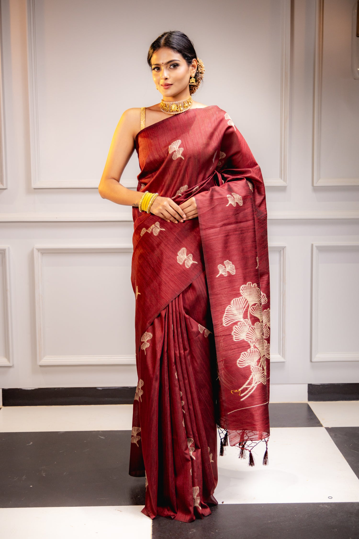 Border & Pallu details : { Border Color: Maroon} { Pattern: Floral } { Pallu Color: Maroon} { Pallu Work Type: Has Zari woven border and pallu and Tussel Work at the end }