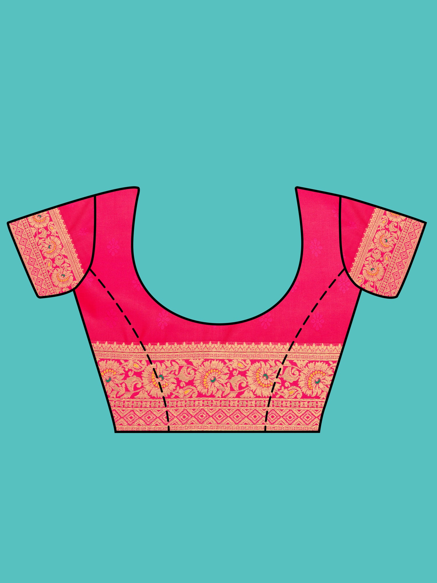 Blouse Details : {Colour- Pink } { Fabric- Art Silk } {Length-0.80 Unstitched Blouse Attached At the End Of Saree } {Width-44 Inches } { Type- Contrast Blouse }