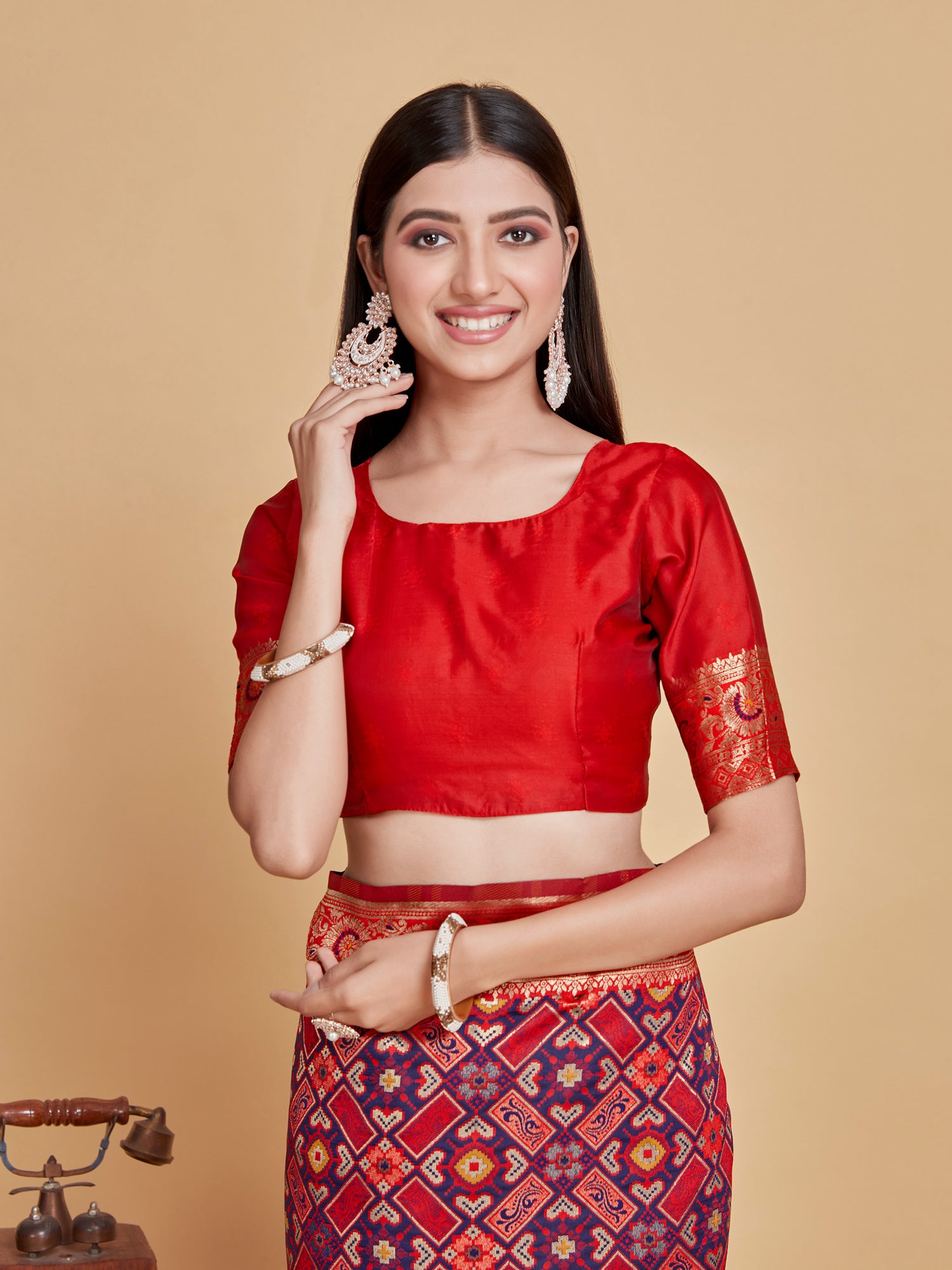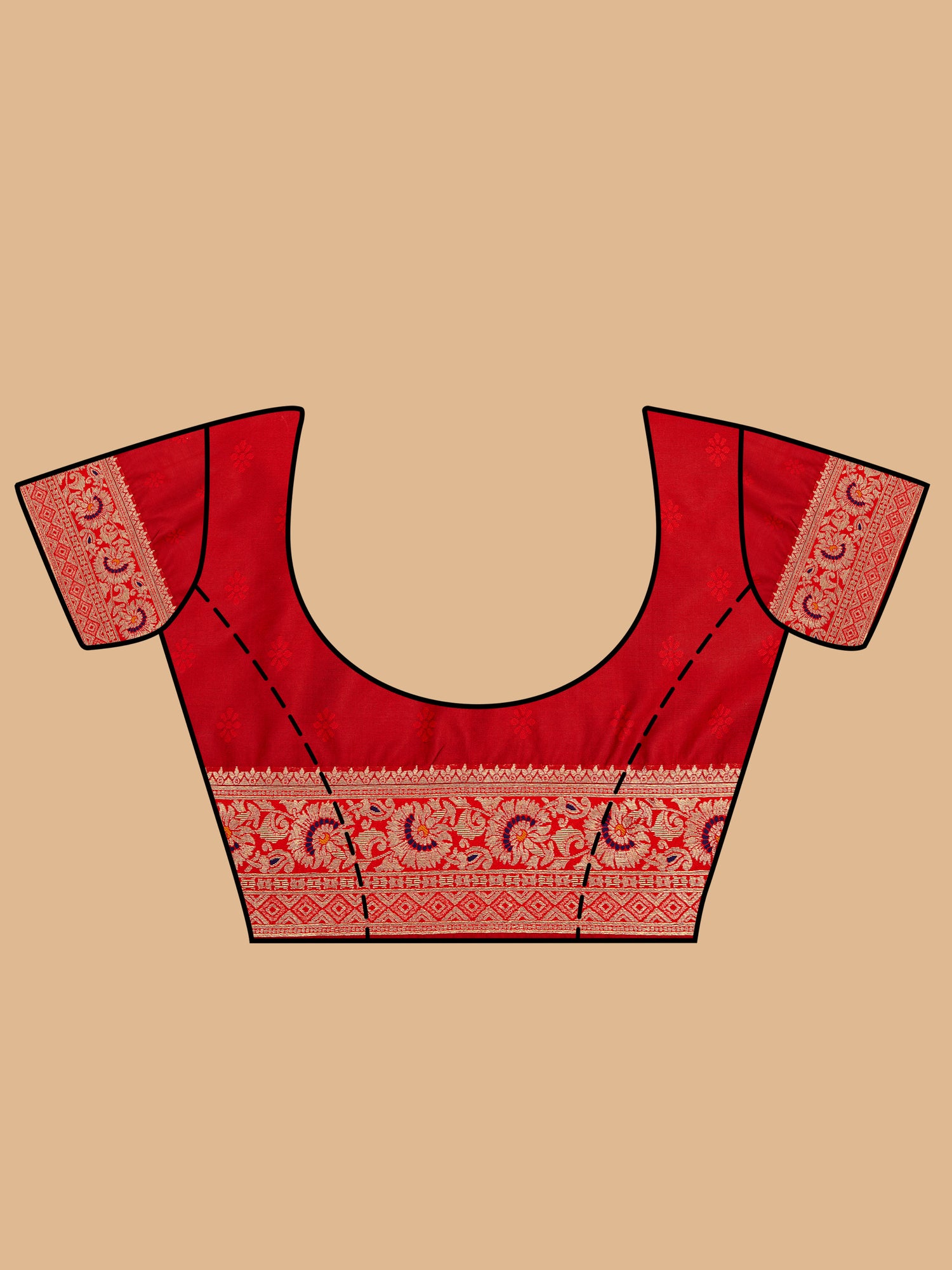 Blouse Details : {Colour- Red } { Fabric- Art Silk } {Length-0.80 Unstitched Blouse Attached At the End Of Saree } {Width-44 Inches } { Type- Contrast Blouse }
