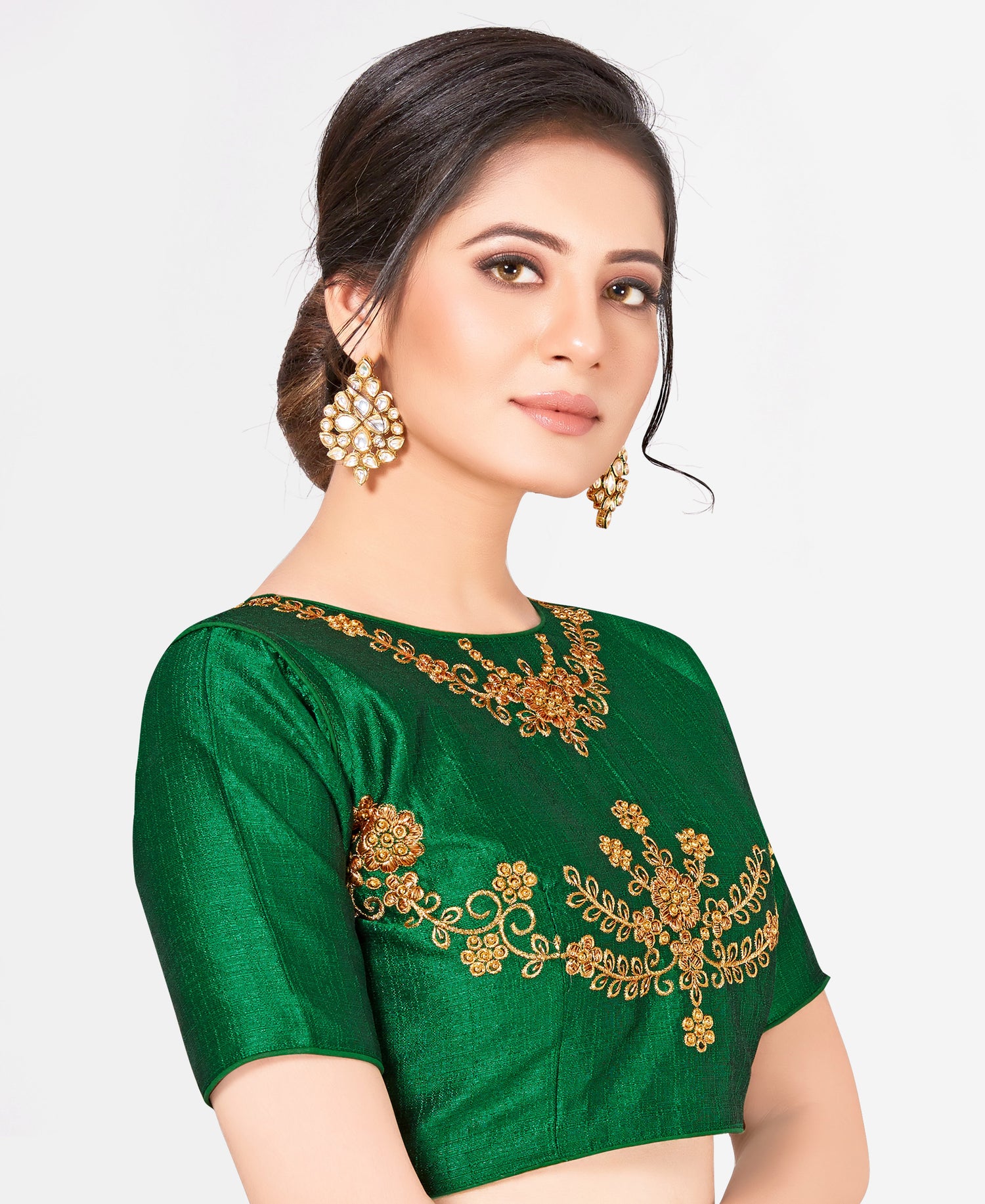 Colour : Green || Fabric : Raw silk Sleeves : Half Sleeves || Closure : Hook (From Back Side) Neck : Boat neck || Padded : Yes || Work : Hand Work (Front And Back )Disclaimer : Slight colour variation is possible due to photographic effects and, Product colour display may change mobile to mobile and PC to PC due to different screen resolutions of devices.
