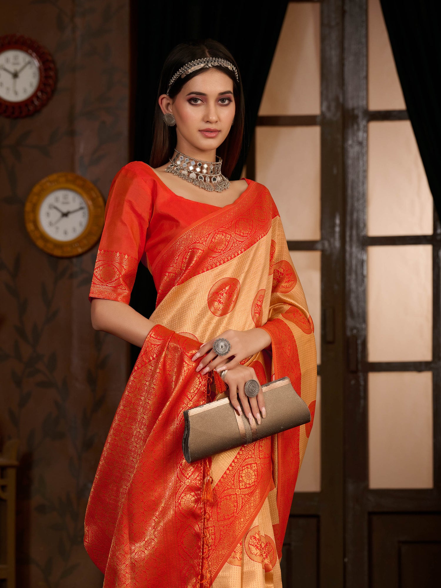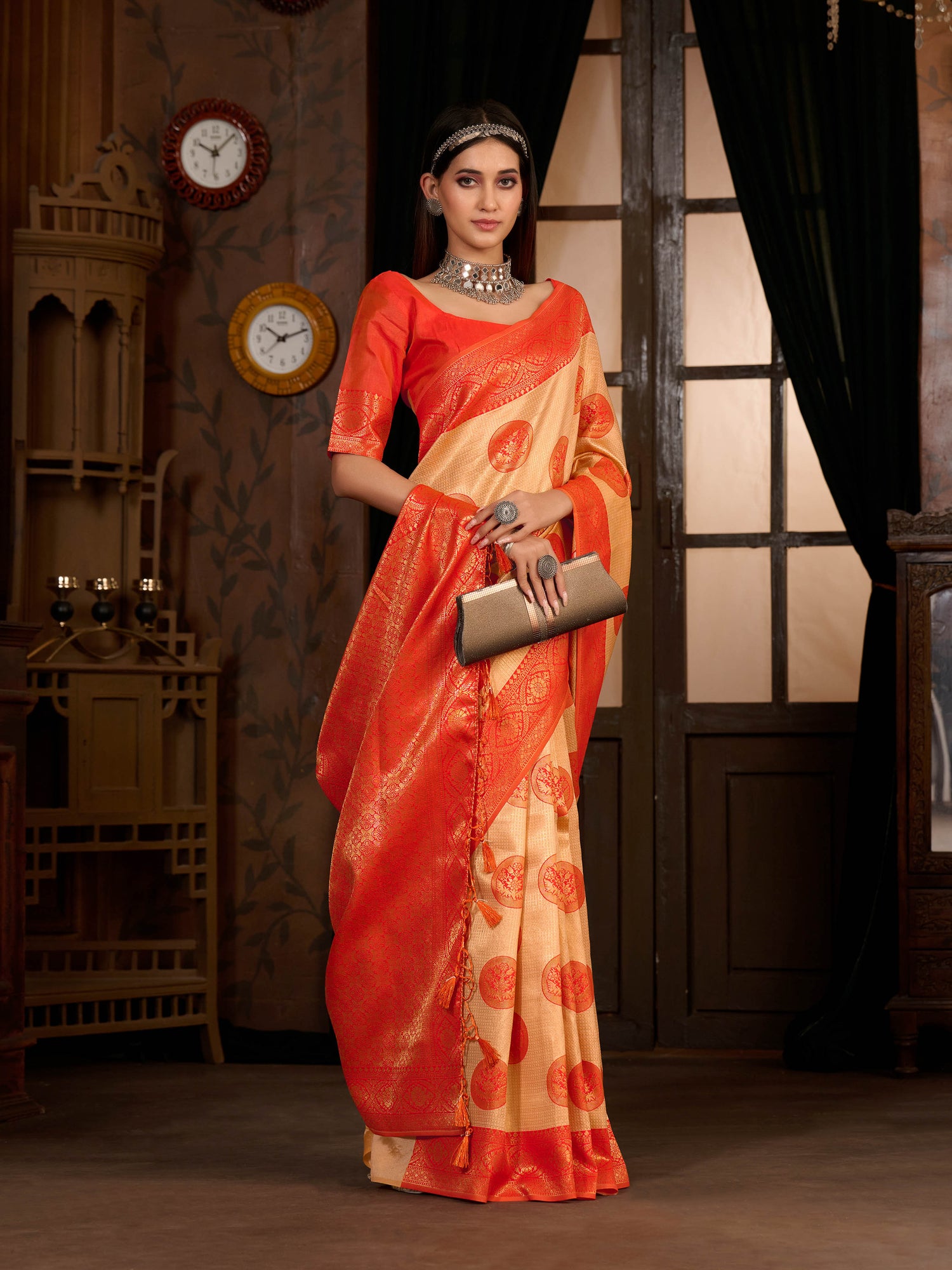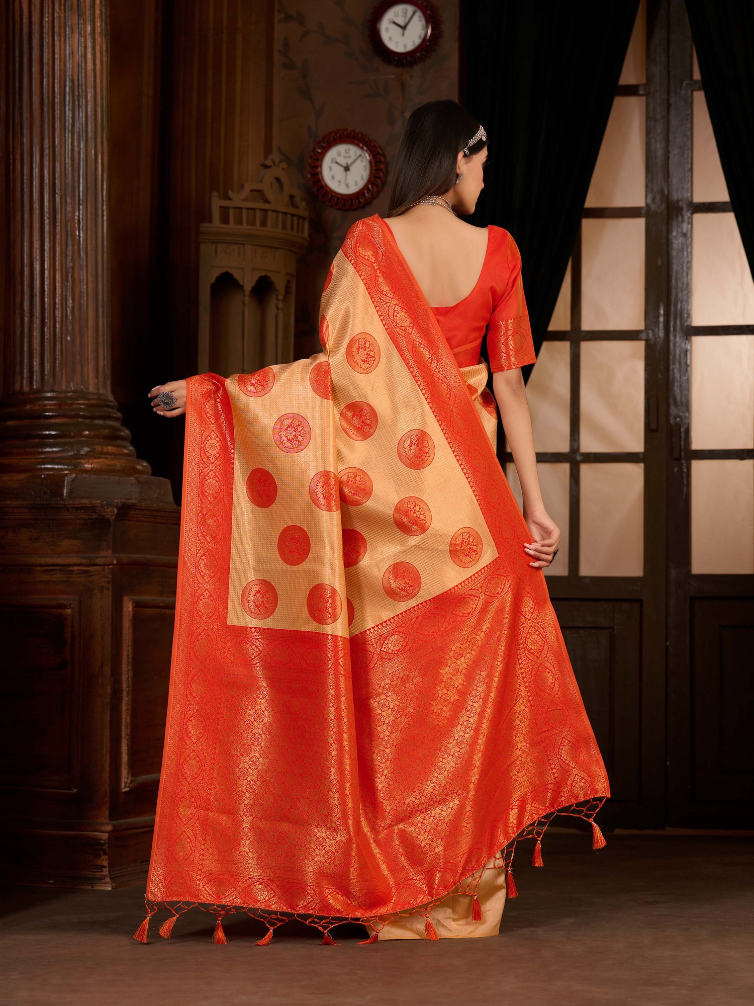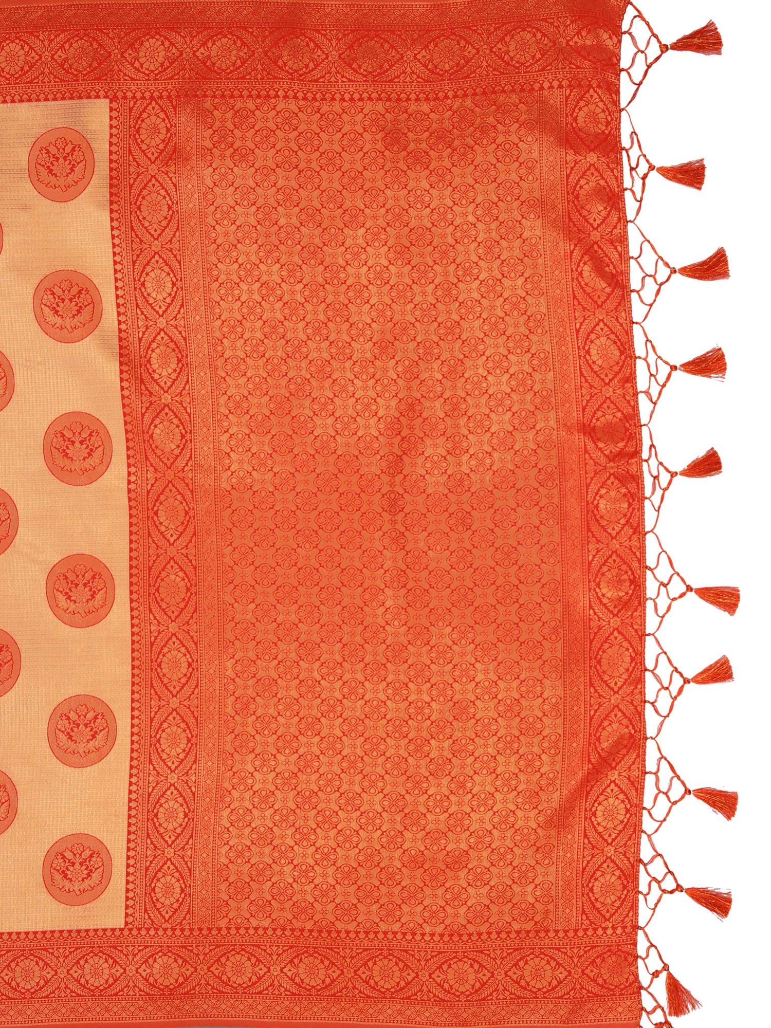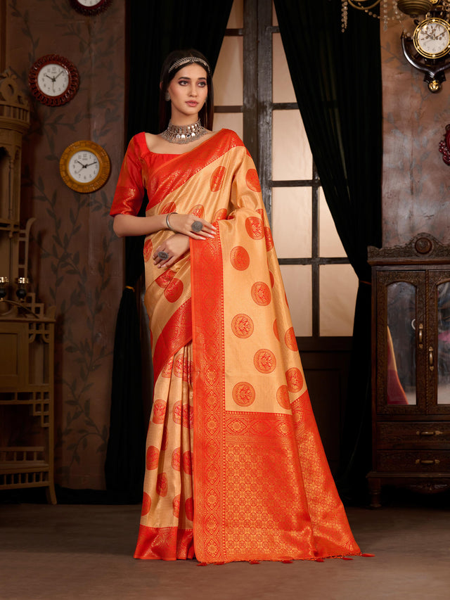 Saree Details : { Colour- Peach } { Fabric- Art Silk } { Length-5.4 mts+0.80 Mts Blouse=Total 6.2 Mts} { Width-44 Inches } { Work Type- Woven Mixture Of Zari And Woven Thread design All over }