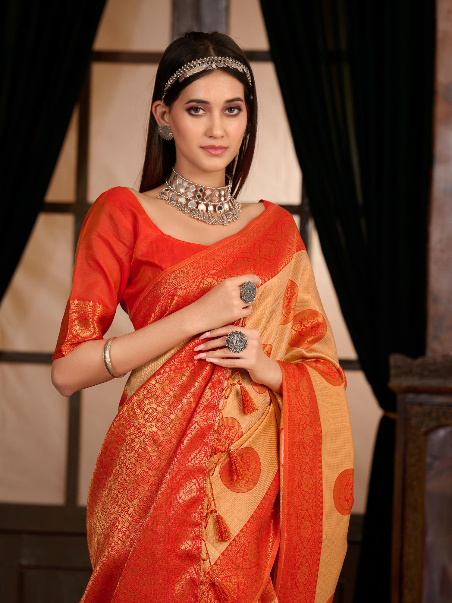 Story & Style Note : Elevate your style with exquisite Kanjivaram sarees, a timeless embodiment of Indian elegance. Crafted with precision and rich heritage, these silk sarees are a fusion of tradition and luxury. Pair a vibrant Kanjivaram with a contrast blouse for a striking look at weddings or opt for a classic, subtle design for a graceful office ensemble. Draping it in the traditional South Indian style with pleats and pallu neatly pinned will exude sophistication. Explore our Kanjivaram collection for a touch of opulence in every occasion