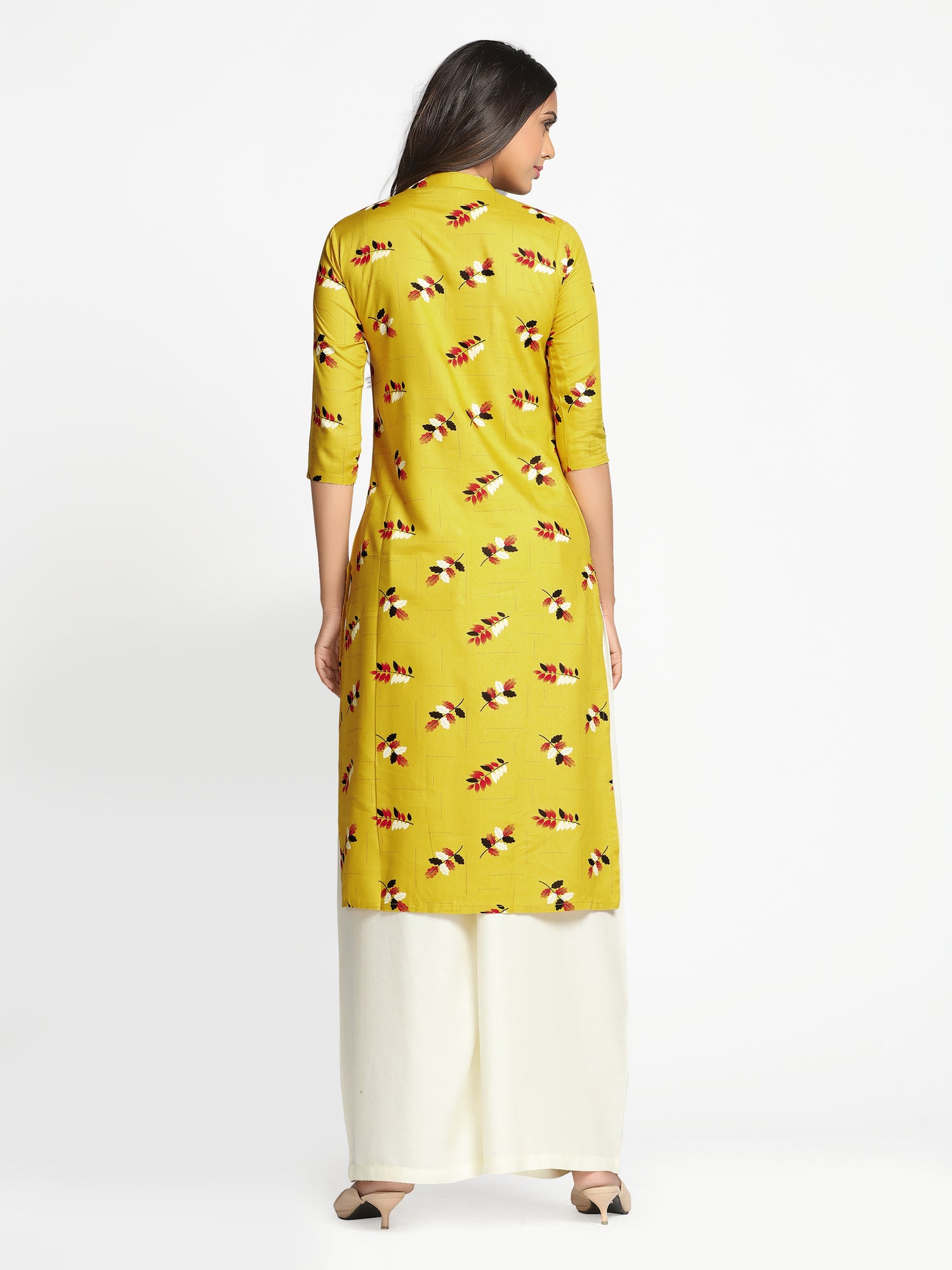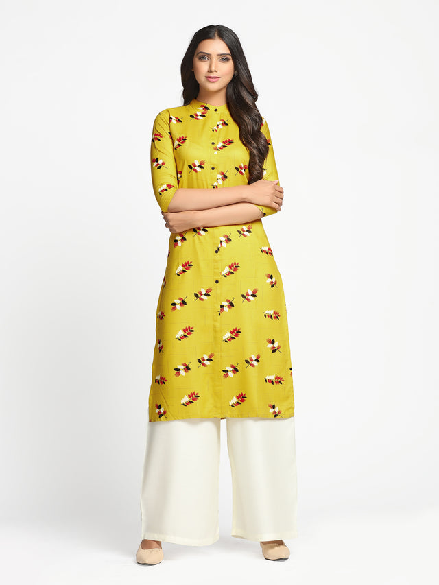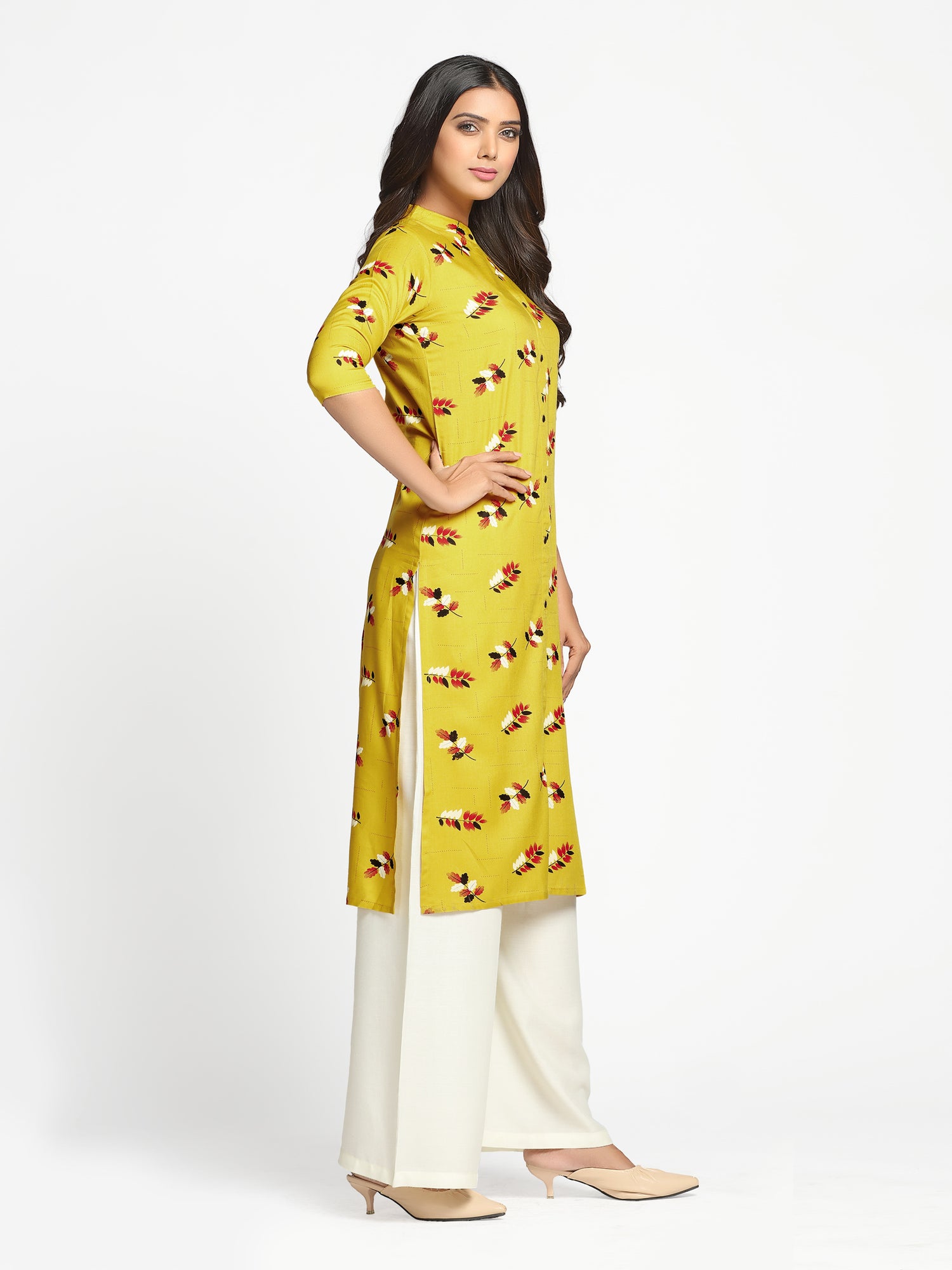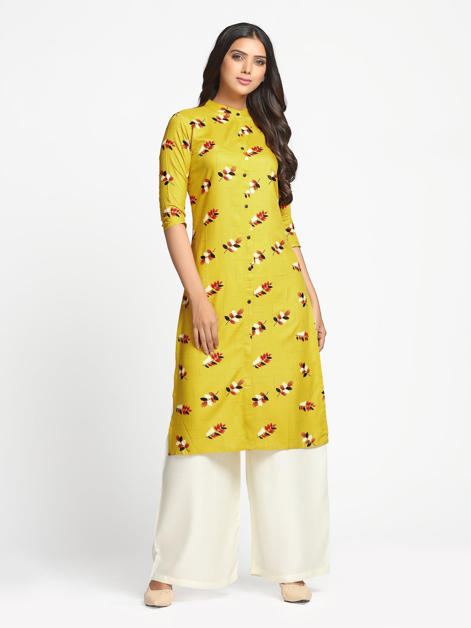 Color : Yellow Shape: Straight || Length: Calf Long || Hemline: Curved || Neck: Round Neck Slit Detail: Front and Side SlitsDisclaimer : Slight colour variation is possible due to photographic effects and, Product colour display may change mobile to mobile and PC to PC due to different screen resolutions of devices.